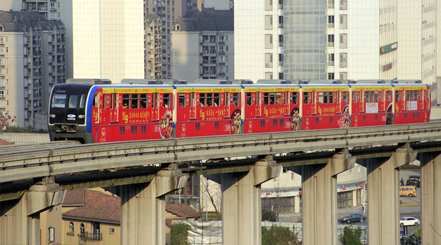 紅九九號(hào)輕軌在城市中穿越
